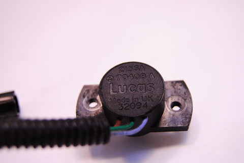 The Throttle Position Sensor on our example system is marked "215SA", "84925A", "Lucas", "Made in UK", and "2499". It has a 3-lead pigtail on it that's about 6" long, and the 3-pin connector on the end of the pigtail is marked "Rists". The three cables to the pigtail are color coded "yellow", "red" and "green" respectively.