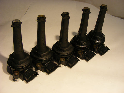 Up for sale is A full set of volvo 5 cyl Ignition coil towers. This is enough for a total replacement in your car! What you get here is a full set from a running driving car that was recently crash damaged. This is the original equipment Volvo / Bosch unit Ignition coil tower, not some cheap aftermarket unit. If you have a misfire code, you should even be able to figure out what coil of yours has gone bad with an OBD-2 reader, replace just that coil, and have a spare for later! If you drive one of these cars daily, or take long trips, you should have a spare on hand at all times! This set came out of a running car with NO DTC's. Frequent Check engine light volvo DTC's related to a failed coil pack? You may have a P0301 P0302 P0303 P0304 P0305 - all which relate to a BAD coil pack.